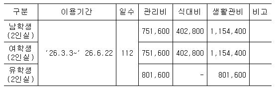 2026학년도 1학기 학생생활관 입사 신청 안내드립니다. 1. 신청대상: 2026학년도 1학기 재학생(복학생), 신편입생, 대학원생(유학생) 2. 신청기간: 2026.01.29.(목) 09:00 ~ 02.12(목) 12:00까지 3. 합격자 발표 및 납부기간 가. 합격자 발표: 02.13(금) 15시 / 홈페이지 별도 공지 나. 고지서 출력 및 생활관비 납부기간: 2026.02.13(금) 15:00 ~ 02.20(금) 16:00까지 다. 납부금액 ※ 남학생생활관 1인실 폐지(제3차 학생생활관 운영위원회 의결사항(2025.12.15.)) 붙임 2026학년도 1학기 학생생활관 입사안내 공고문_공지용 1부. 끝. |